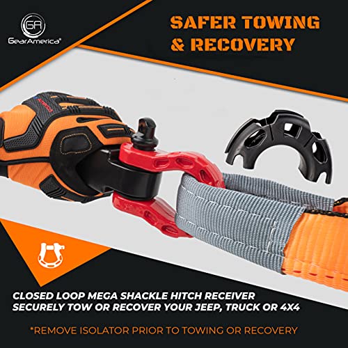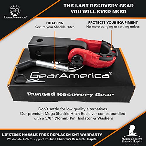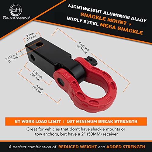 GearAmerica Aluminum Hitch Receiver 2"x2" Black + Red Mega Shackle® | 32,000 LBS (16T) MBS 16,000 LBS (8T) WLL | Heavy Duty Towing and Recovery for 4x4 | Includes Mega Shackle, Washers, and ⅝ Pin