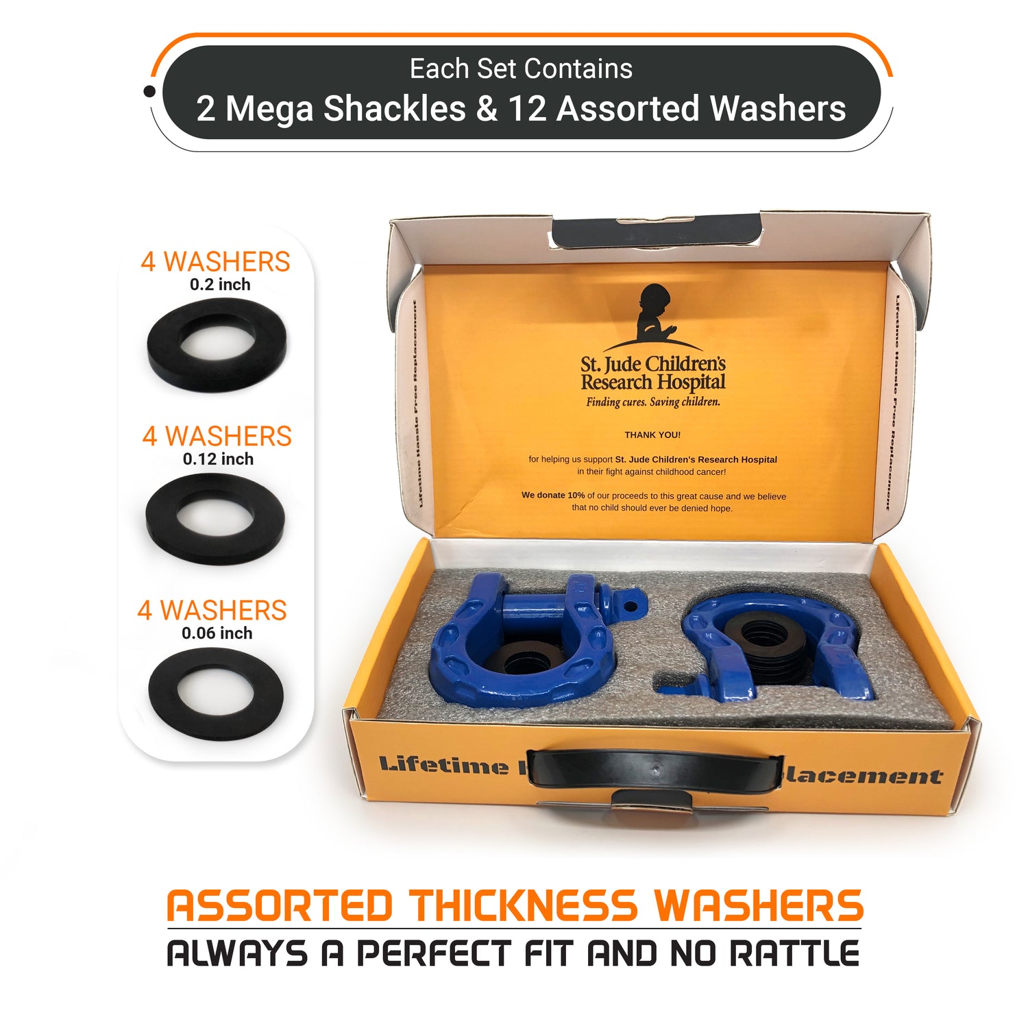 As a Free Bonus - we've bundled assorted Washers with each Mega Shackle which greatly reduces rattling and protects from scratching