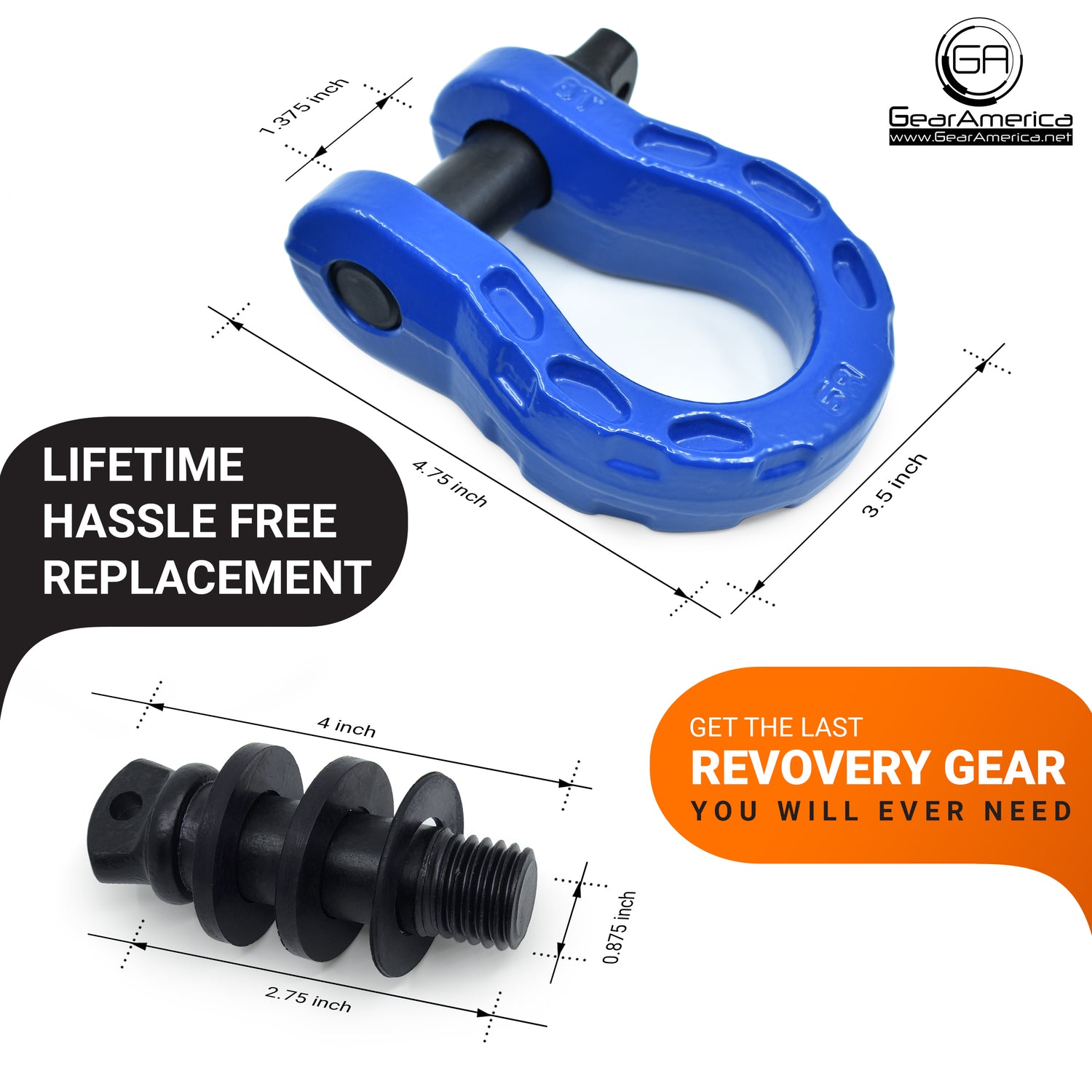 Stronger than 3/4" D Rings | Tow Shackle + 7/8" Pin + Washers | Securely Connect Tow Strap or Winch Rope to Truck or SUV for Off-Road 4x4 Recovery