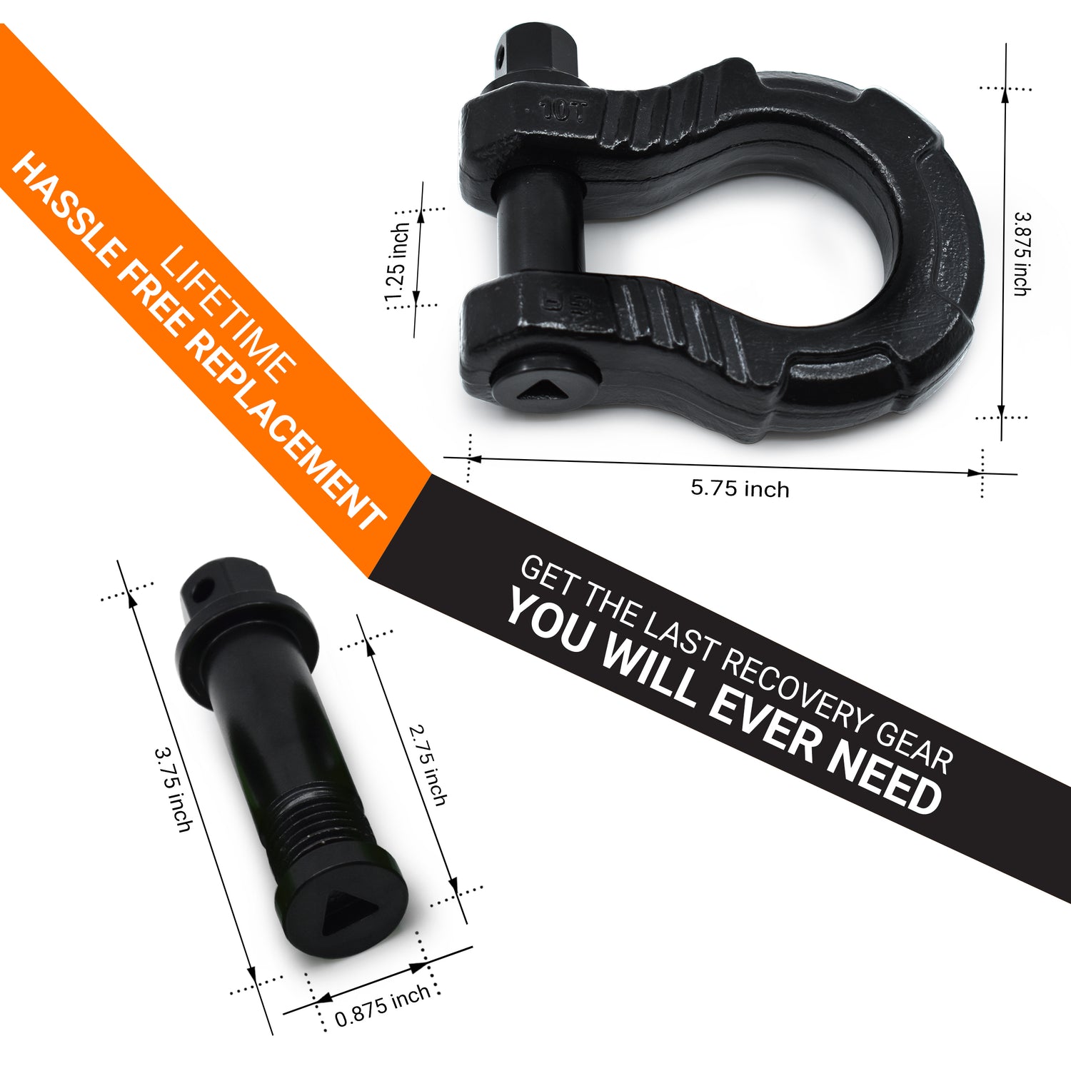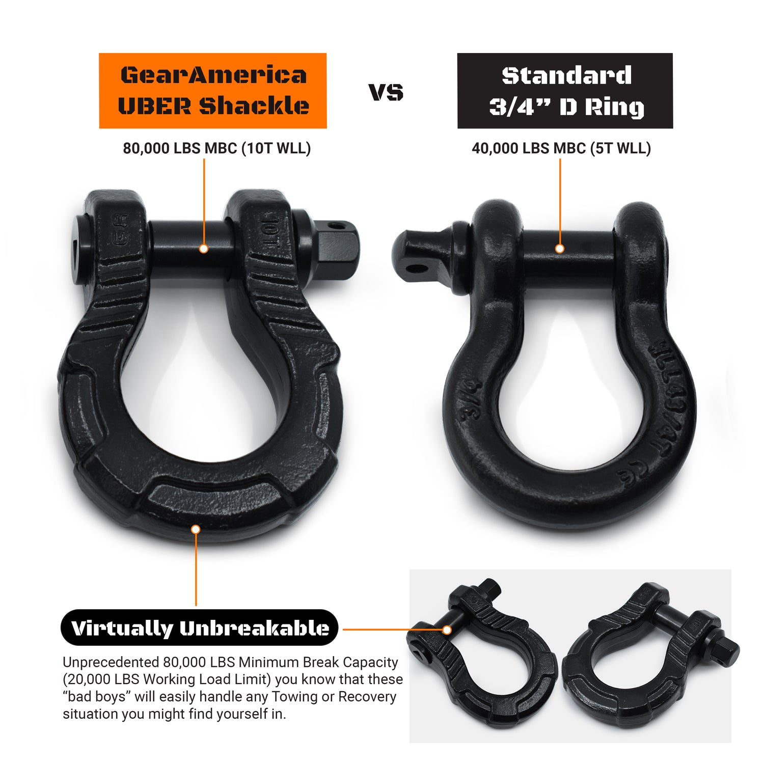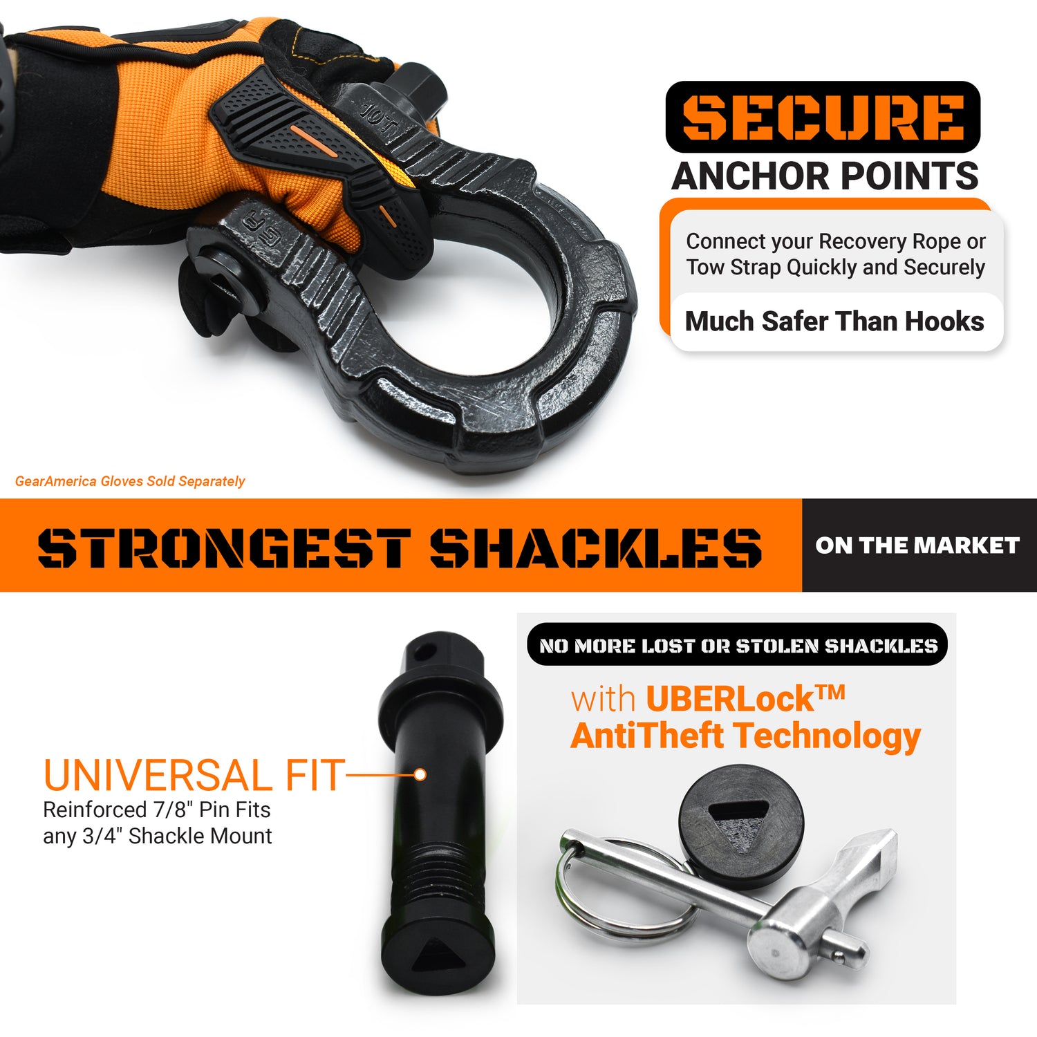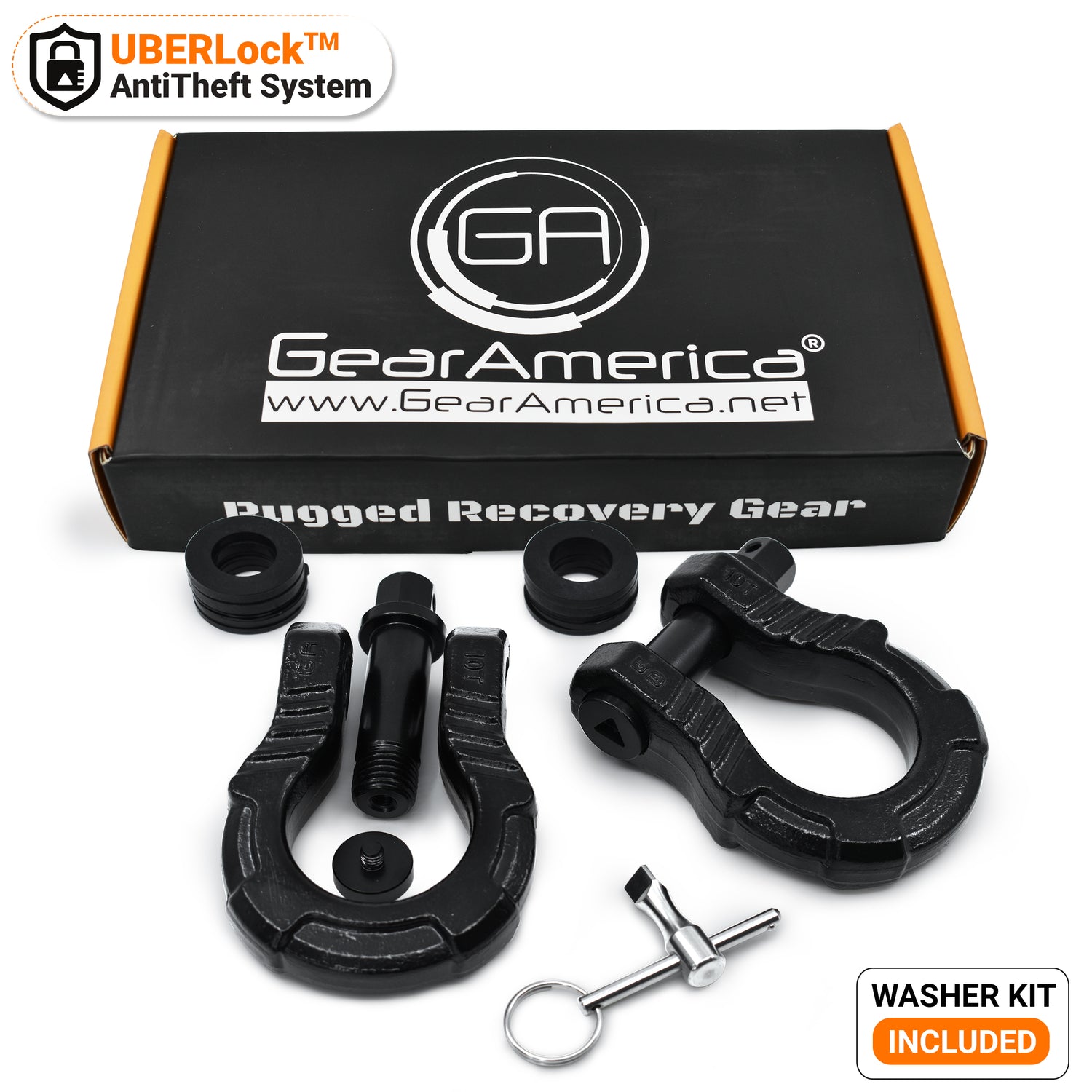 GearAmerica UBER Shackles with Anti Theft Lock (2PK) Black | 80,000 lbs (40T) Ultimate Strength | Towing D-Rings + UBERLock Security Pin 7/8" + Washers |Safely Connect your Tow Strap or Winch Rope for Off-Road Recovery