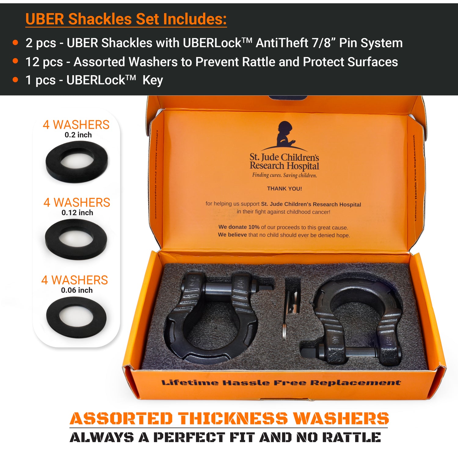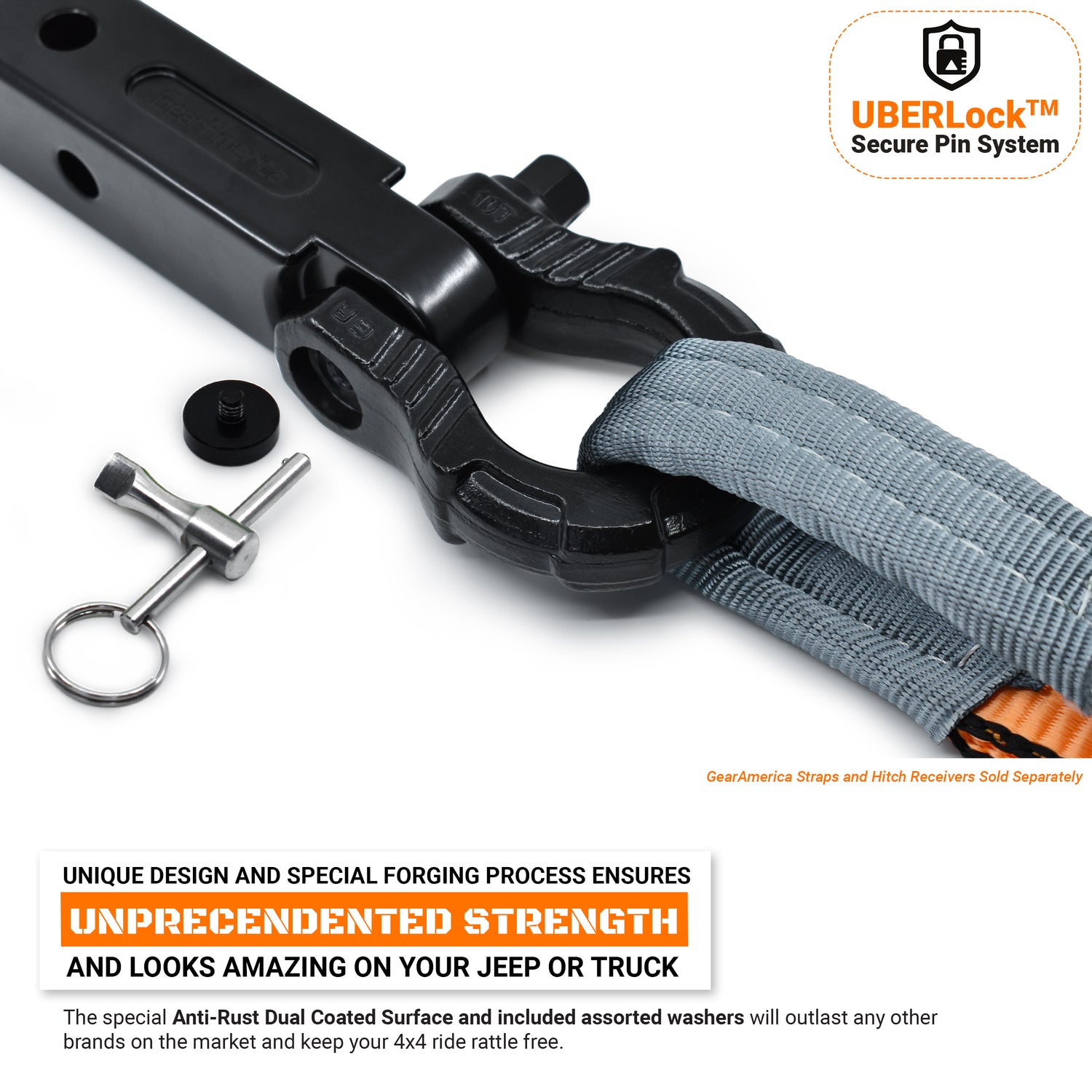 - NO MORE LOST OR STOLEN SHACKLES! - Every GearAmerica UBER Shackles comes with our Patent Pending UBERLockTM AntiTheft technology. This security pin feature ensures that your cool new shackles will not get stolen or accidentally fall off due to driving and vibration. Unlike other security pins on the market, the UBERLockTM pin portion can be easily removed before offroading while keeping the standard ⅞” pin to easily connect or disconnect your Tow Strap or Recovery Rope when needed.
