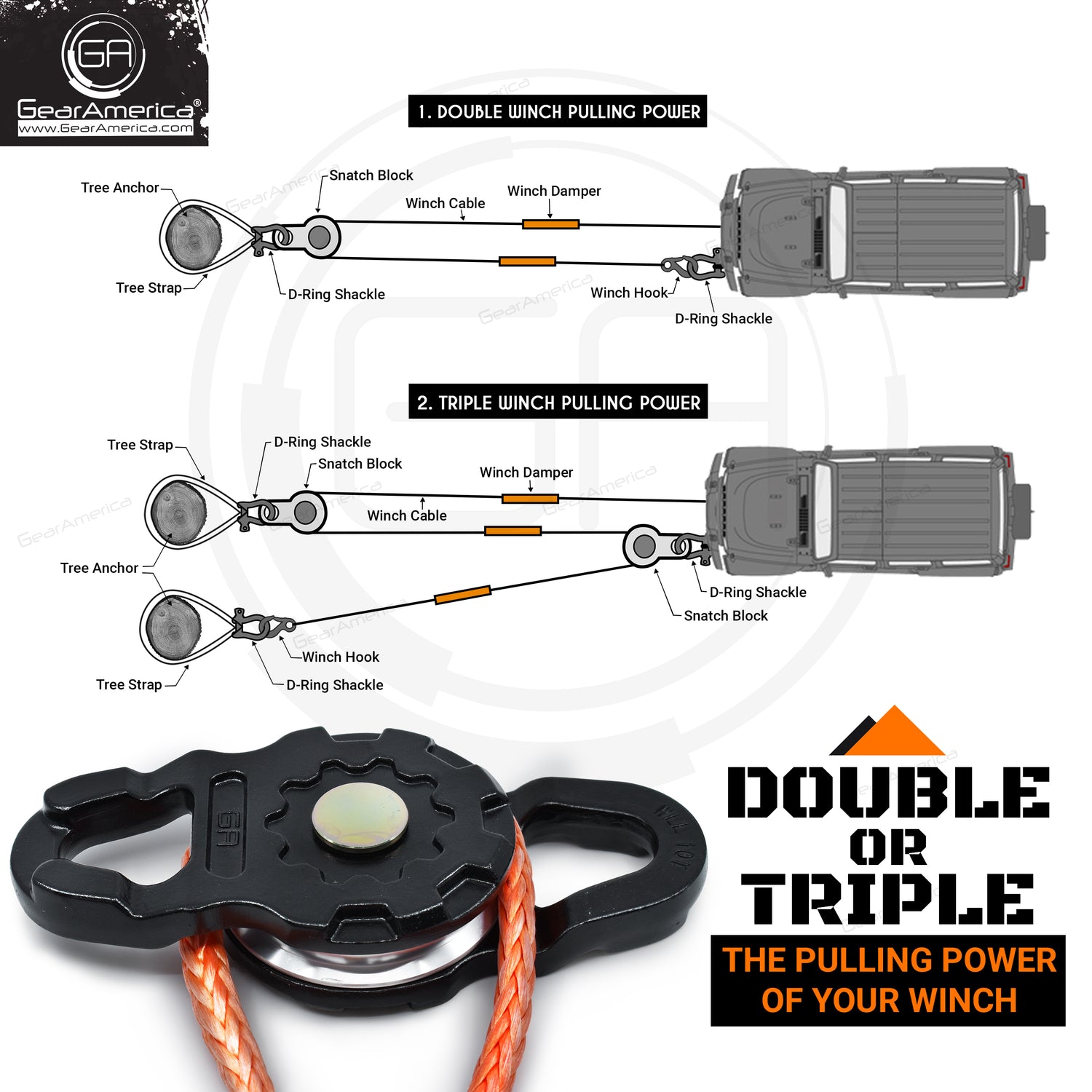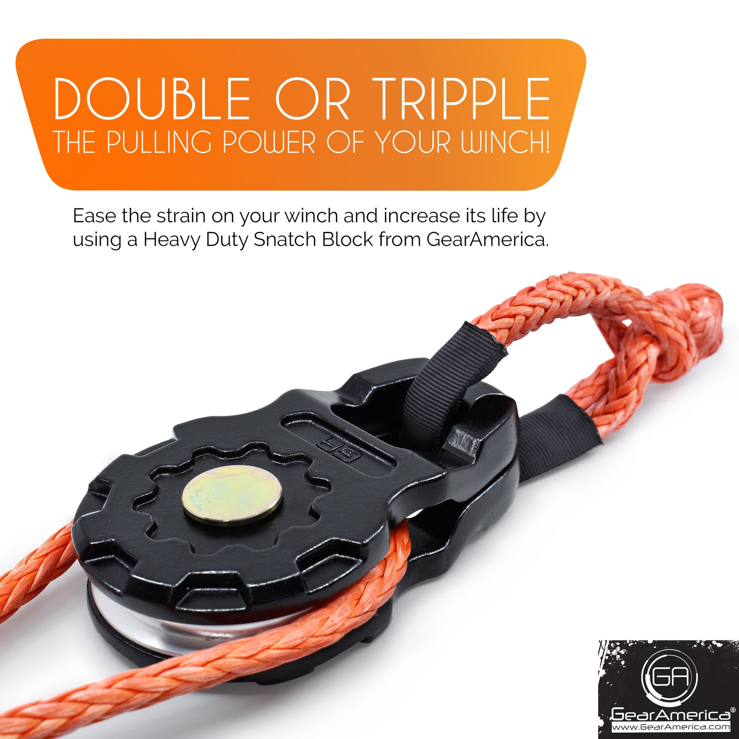 - DOUBLE OR TRIPLE YOUR PULLING POWER! - Double or triple the effective pulling power with the mechanical advantage of the snatch block while you winch. Ease the strain on your winch motor and increase its lifespan by using our ULTRA Snatch Blocks - a truly Universal 4x4 Recovery Tool. Recommended for Winches up to 20,000 LBS capacity.