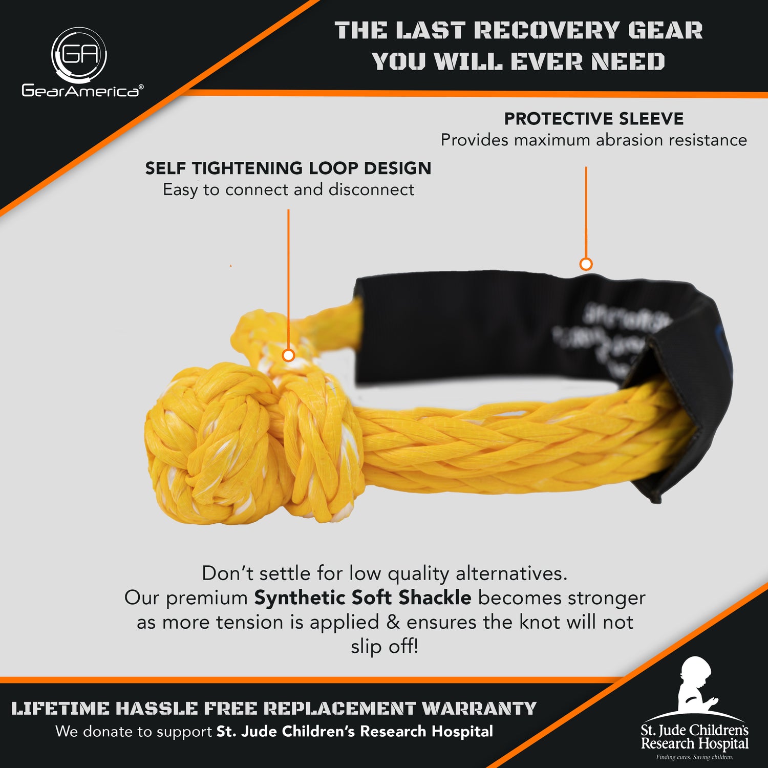 - MADE IN THE USA QUALITY! 100% Made in The USA using locally sourced materials, our rugged Soft Shackles offer Military Grade Strength and Durability. A special vinyl urethane coating and heavy duty protective sleeves provide Maximum Abrasion Resistance and ensure the Longest Lifespan. Why settle for average when you can experience the legendary GearAmerica quality backed by our unprecedented Lifetime Hassle Free Replacement Warranty.