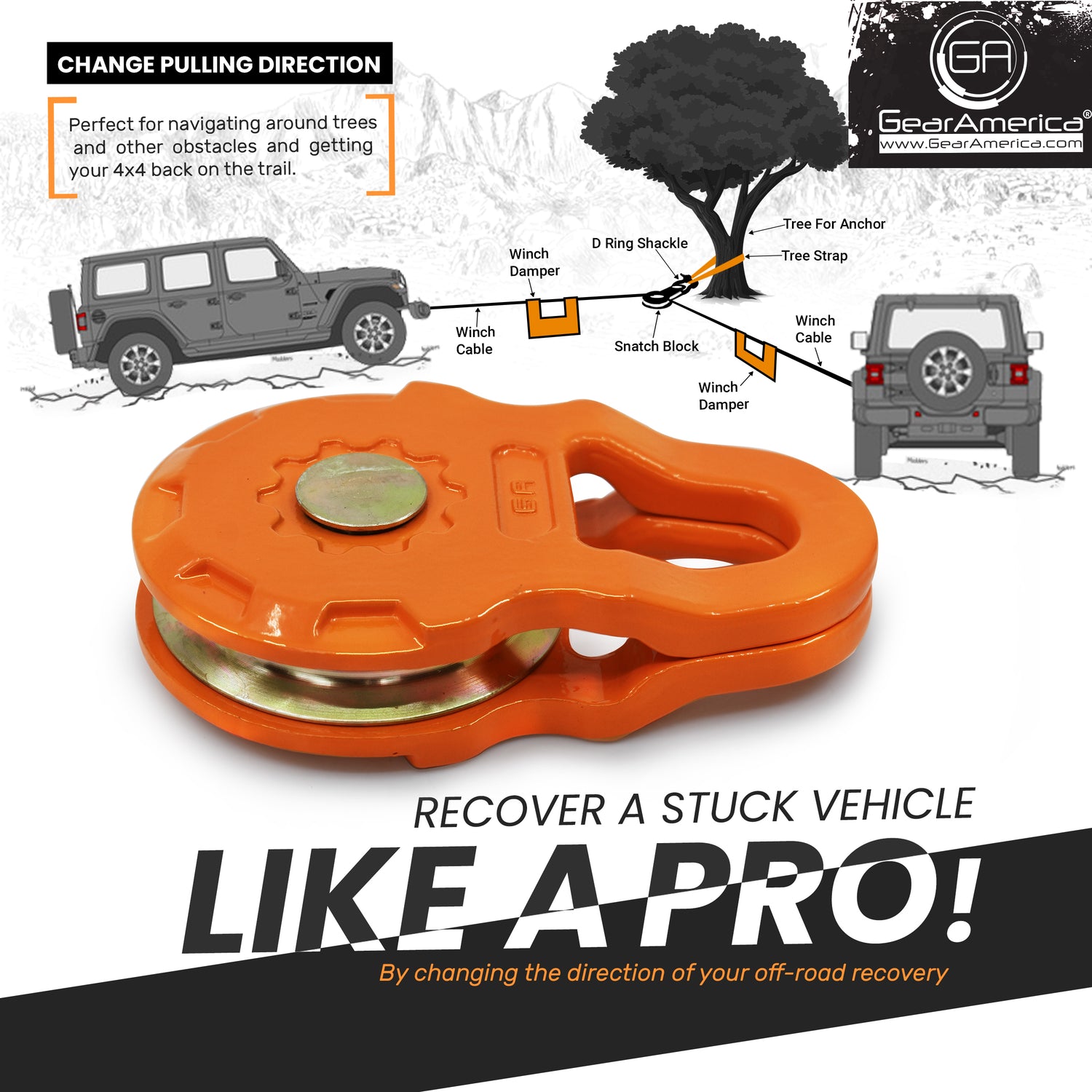 - OFF-ROAD LIKE A PRO! - Effortlessly Recover any Stuck Vehicle by Changing the Direction of your pull. Perfect for navigating around trees and other obstacles to get your ATV, UTV, or 4x4 back on the trail. GearAmerica Snatch Blocks will make even the most challenging and complex recoveries seem like a walk in the park.