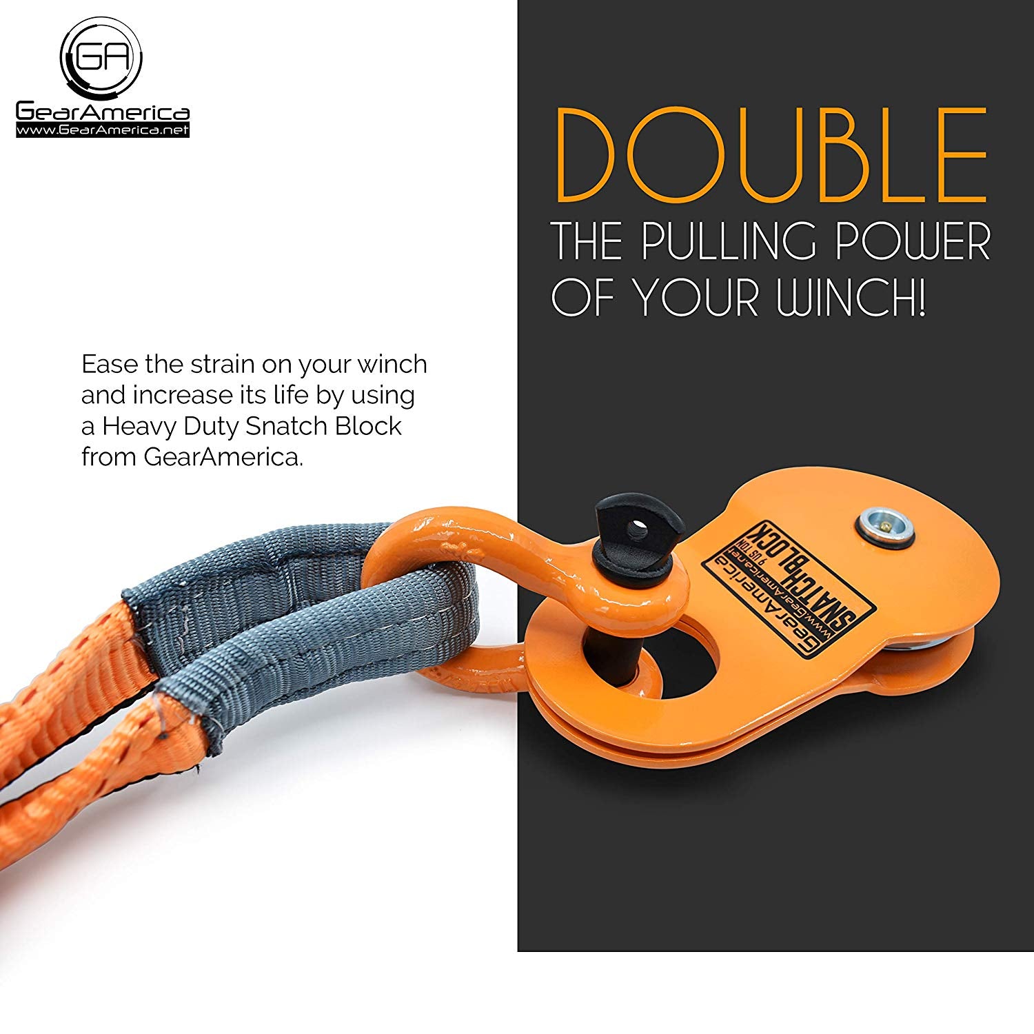 - DOUBLE YOUR PULLING POWER or CHANGE THE DIRECTION OF YOUR PULL Double or triple the effective pulling power with the mechanical advantage of the snatch block while you winch. Want to ease the strain on your winch and increase its life? Need to navigate around trees or other obstacles by changing the direction of your off-road recovery. Both can be easily accomplished by using our Heavy Duty Snatch Block, rated at 9 Tons.